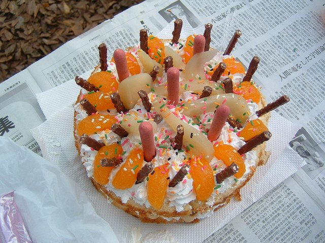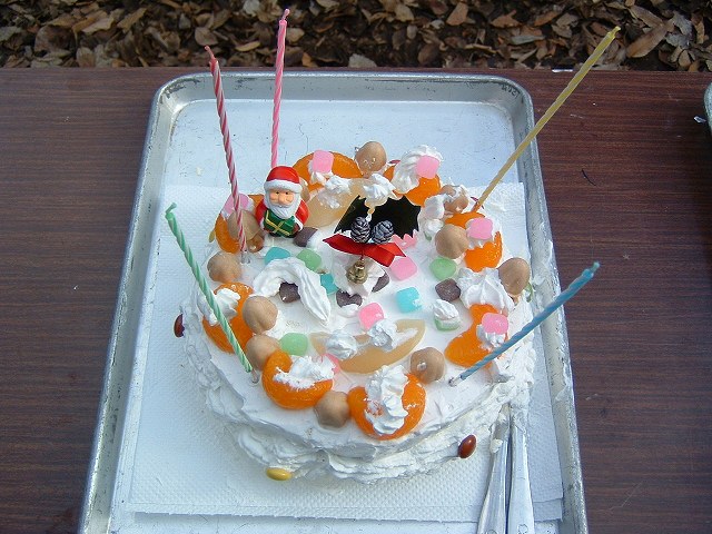 スポンジケーキに生クリーム塗り、各自持参したトピングをデコレート!